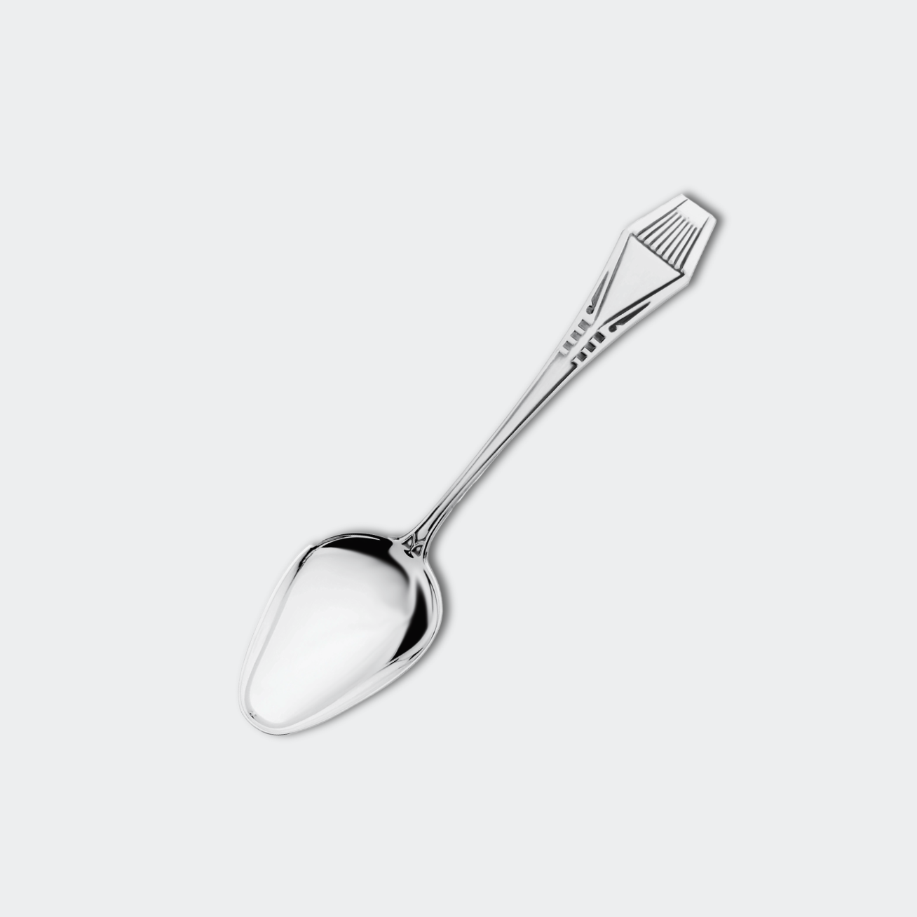 The Suomi dessert spoon from Kultakeskus OY has a detailed and modern decoration that extends from the top of the handle all the way down. The futuristic pattern gives the spoon a unique character and makes it a stylish addition to both festive and everyday table settings.