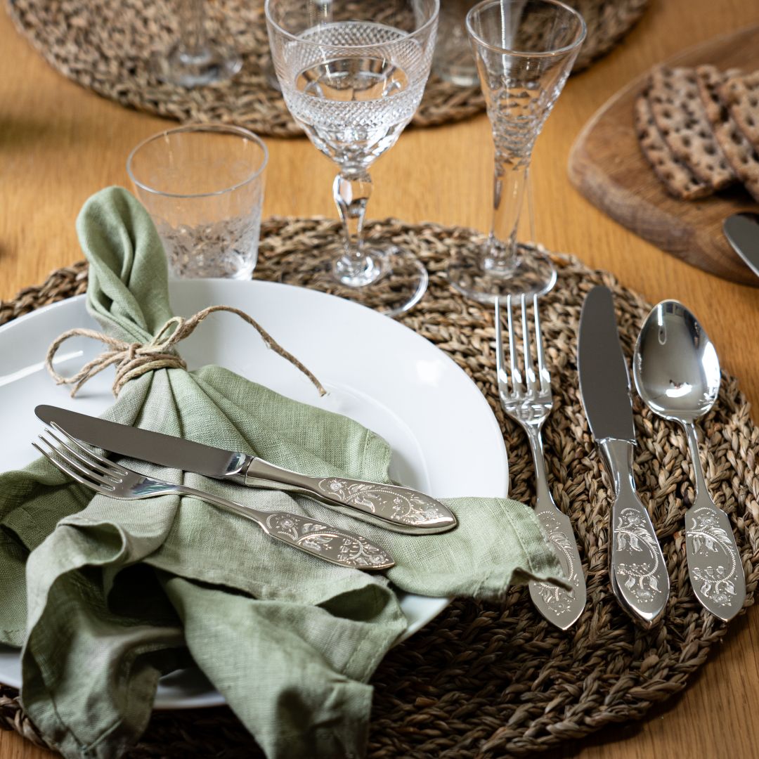 The Tornedal table knife from Juveel is a beautifully designed model with soft shapes and a hand-engraved handle. The pattern depicts the rare plant Finnmyrten, which originates in Lapland. The unique engraving gives the knife a natural and timeless feel, perfect for both everyday table settings and formal occasions.