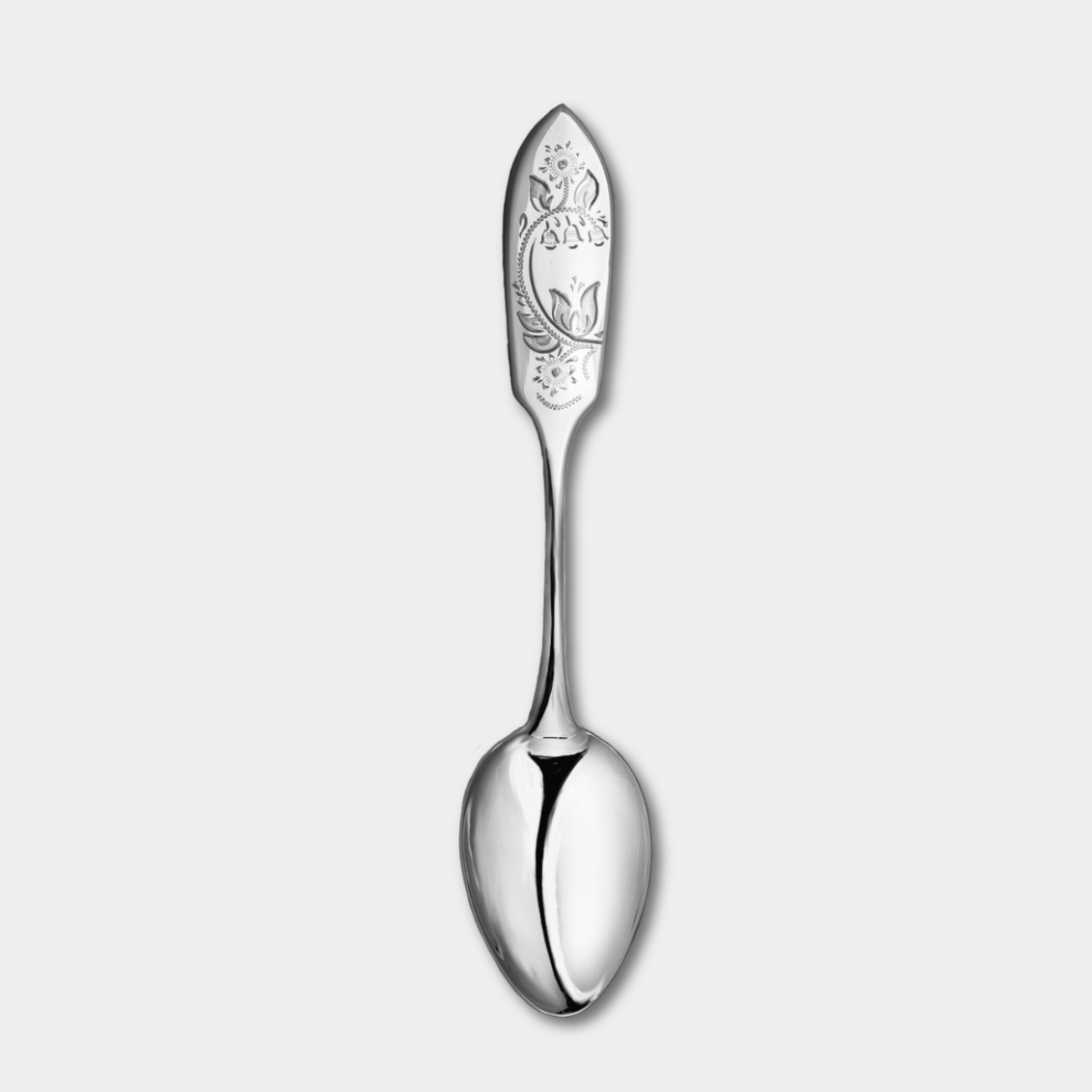 The Tornedal table spoon from Juveel is a beautifully crafted silver model with a high-gloss surface that gives a timeless and elegant feel. The handle is adorned with a hand-engraved pattern inspired by the rare Finnmyrtle plant, making each spoon unique and full of character.