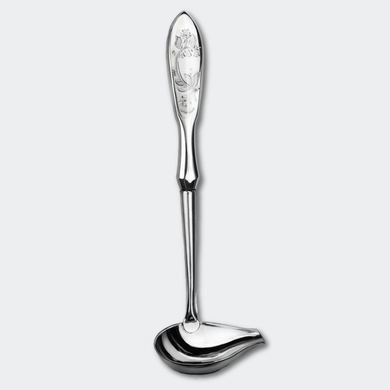 A beautifully designed sauce spoon with a polished silver handle and stainless steel scoop, where the hand-engraved pattern of the rare Finnmyrtle plant is a unique and beautiful detail. Perfect for both everyday dinners and festive table settings where craft and function meet.