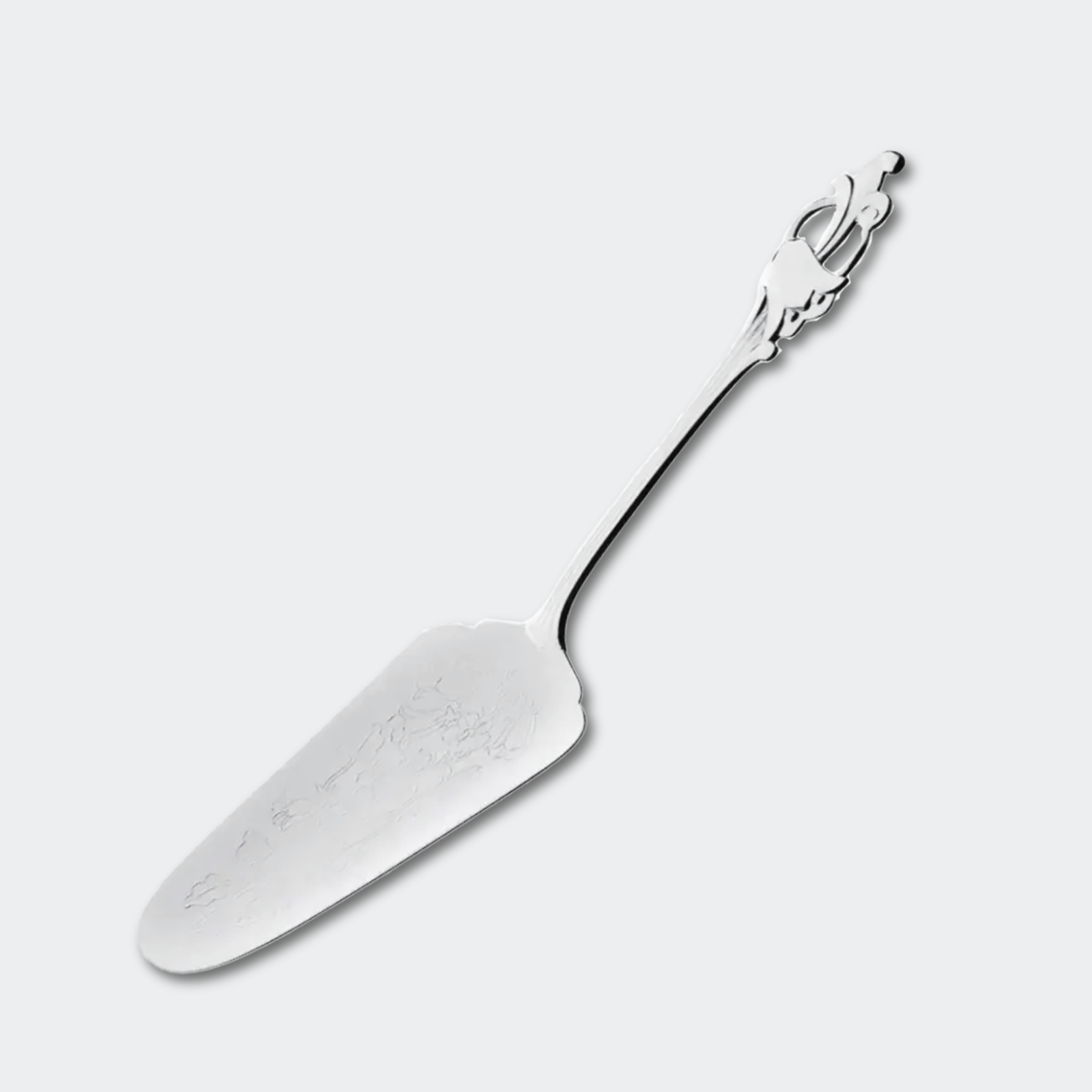En vacker pajspade med skaft i silver och rostfritt blad, utsmyckad med en detaljerad blåklocka som ger en romantisk och somrig känsla. Perfekt för både vardagsfikat och festliga tillfällen, där den blir en vacker detalj vid serveringen.