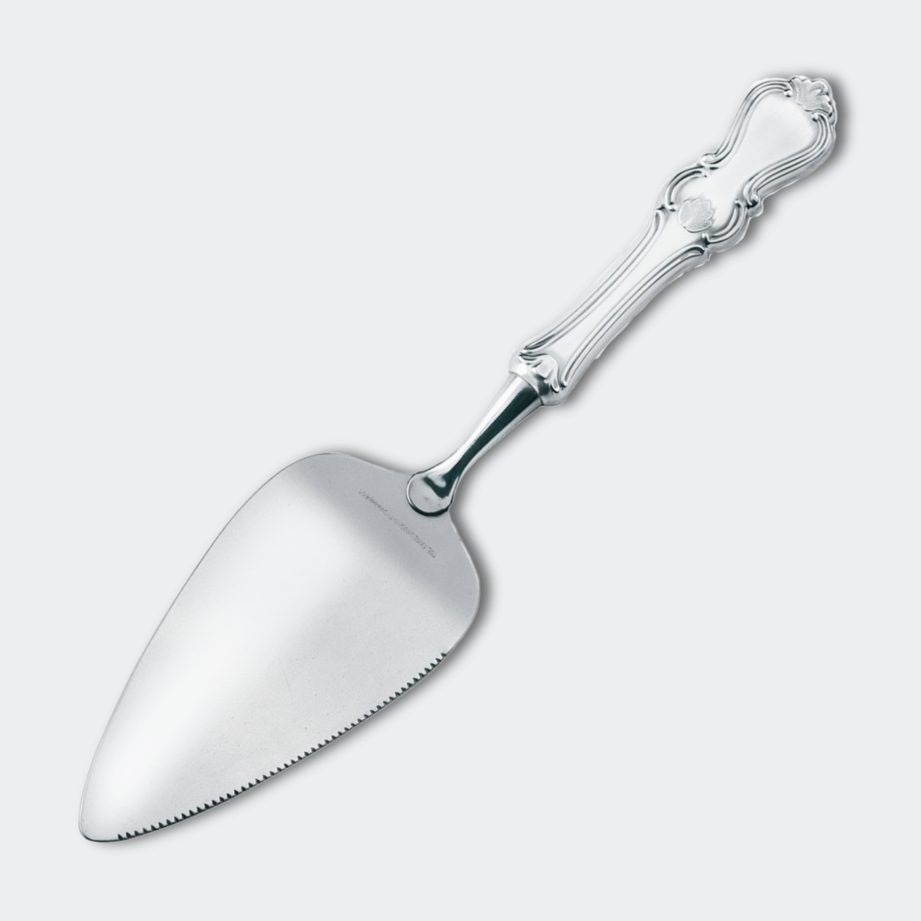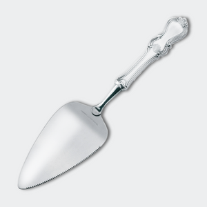En vackert utsmyckad pajspade med skaft i silver och rostfritt blad, designad med en romantisk och detaljerad utsirning på framsidan, medan baksidan är glanspolerad och slät för en stilren kontrast. Perfekt för eleganta dukningar och speciella tillfällen. Observera att detta är en beställningsvara. Ca 2 veckors leveranstid.